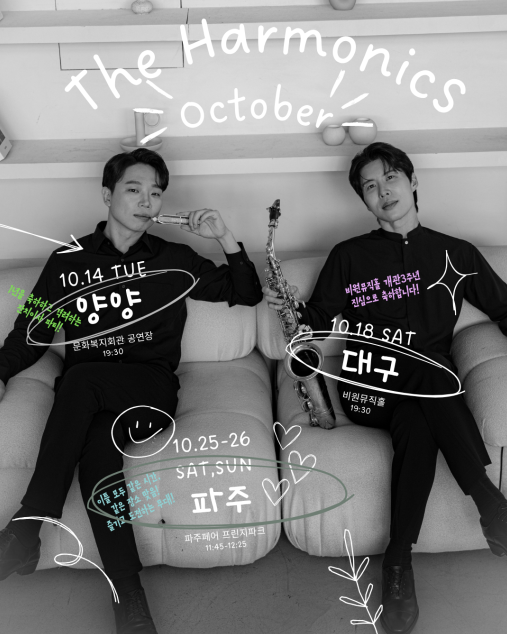 하모니시스트 박종성과 클래식 색소포니스트 브랜든 최의 프로젝트 앙상블, ‘더하모닉스’가 10월, 양양과 대구, 파주의 무대를 빛냈습니다! 이번 공연들은 각 지역의 공연예술 발전을 기념하는 무대로서, 더 많은 청중과 만나는 뜻깊은 자리였답니다. 😊